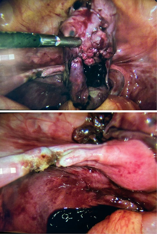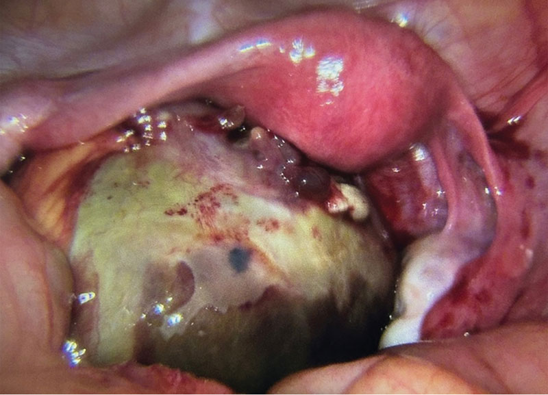 В случае тугого перекрута наблюдаются явные признаки некроза придатков матки: изменение и потеря анатомических контуров, багрово-синюшный, а иногда и черный цвет. При обнаружении этих признаков необходимо провести аднексэктомию.