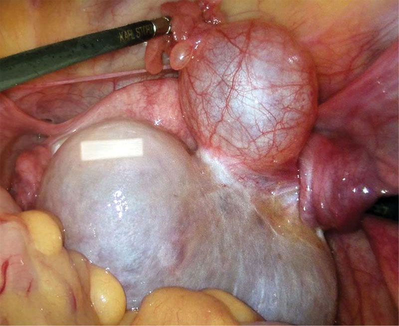 Если при осмотре придатков матки визуализируется сохранение анатомических контуров с выраженным отеком и темно-розовым цветом, целесообразно придерживаться органосохраняющей тактики, поскольку перекрут нетугой. Сегодня используется методика деторсии ротированной структуры [26, 27]. После раскручивания придатка матки сохраняется выраженный отек яичника, который можно ошибочно принять за кистозный компонент. В случае находки объемного образования в проекции яичника необходимо провести цистэктомию [28]. По данным исследований, после деторсии ротированного придатка матки яичник сохраняет свою функцию [29, 30].