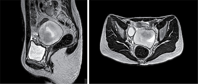 По данным УЗИ ОМТ, выполненного в стационаре, выявлено объемное образование в области малого таза. МРТ ОМТ показала кистозно-солидное образование в правом яичнике с геморрагическим компонентом и мультифолликулярную структуру левого яичника (рис. 5). Анализы крови на онкомаркеры были в пределах возрастной нормы. Врачи приняли решение направить пациентку в РДКБ – филиал РНИМУ им. Н.И. Пирогова для дальнейшего обследования и лечения.