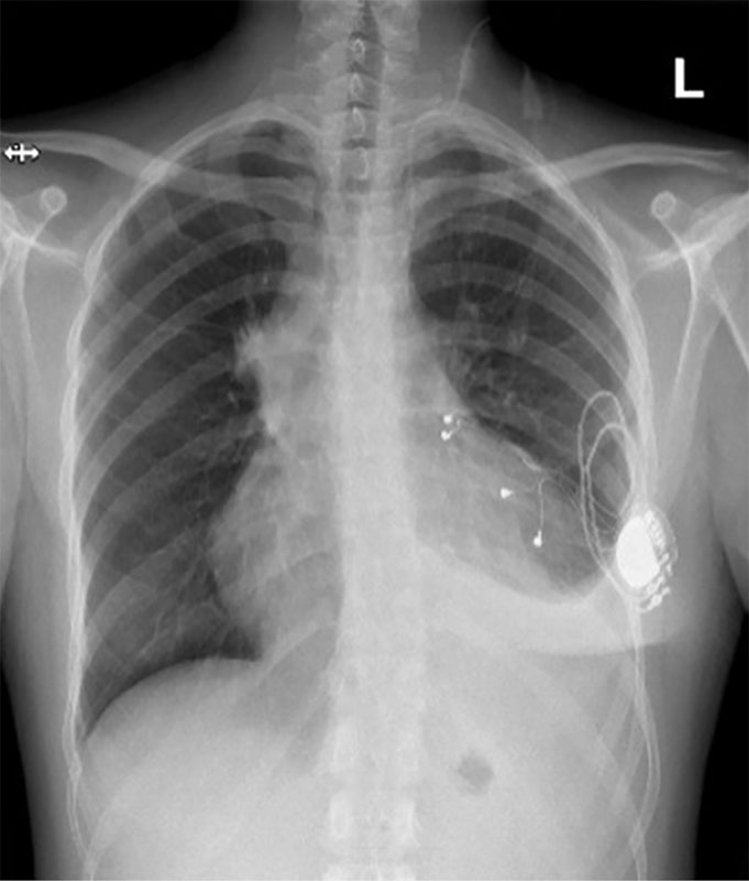 Медицинские вмешательства. Изначально после госпитализации был установлен временный однокамерный нечастотно-адаптивный ЭКС. Затем, через две недели, выполнена имплантация двухкамерного ЭКС Medtronic Attesta DR MRI SNFNB211604G.