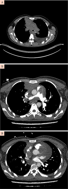 Этап 3 – компьютерная томография (КТ) и онконастороженность. В стационарных условиях выполнена КТ органов грудной клетки с внутривенным контрастированием для исключения ТЭЛА (рис. 3). Описано объемное образование примерными размерами до 64 × 32 × 103 мм в переднем верхнем средостении с распространением в S3 правого легкого и вероятностью вовлечения перикарда. В структуре образования открывается просвет субсегментарных бронхов S3 справа. Гиповентиляция базальных отделов легких. Утолщение междолькового интерстиция в обоих легких, на этом фоне определяются нечеткие субсолидные очаги субплеврально с обеих сторон. Трахея, крупные бронхи проходимы. Состояние после установки центрального венозного катетера, дистальный конец катетера в просвете ВПВ. Дефект контрастирования просвета ВПВ протяженностью до 65 мм. Дефект контрастирования просвета легочного ствола протяженностью до 46 мм. Скопление выпота в полости перикарда толщиной слоя до 32 мм. Внутригрудные лимфоузлы не дифференцируются. Выпот в плевральных полостях не определяется. Аксиллярные лимфоузлы не увеличены. «Свежих» костных травматических изменений в зоне контрастирования не выявлено.