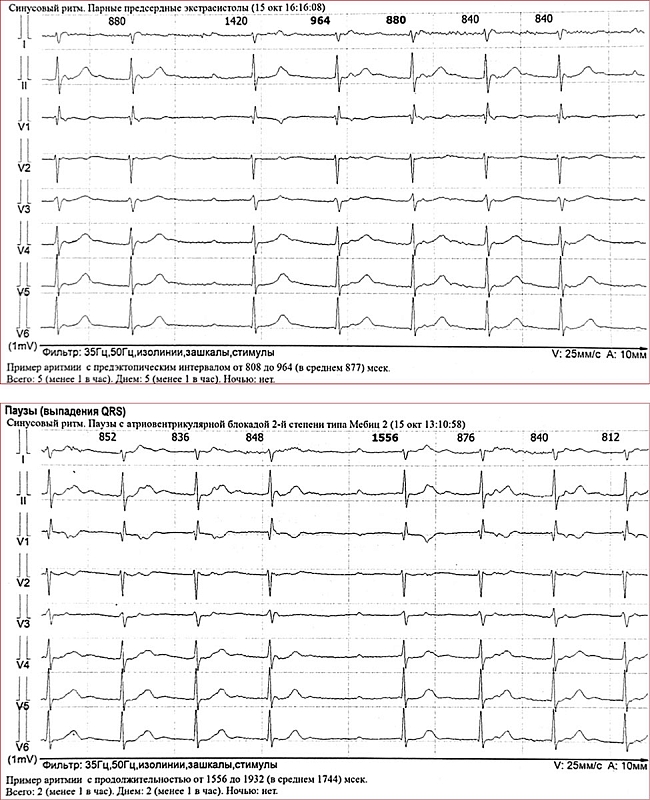 В ходе опроса на приеме у кардиолога КДЦ 11 октября пациентка вспомнила, что в момент урежения пульса вызывала скорую медицинскую помощь. С ее слов, приехавший по вызову врач сделал ЭКГ, но нарушения ритма и проводимости не были зарегистрированы. Кардиолог КДЦ дал направления на эхокардиографию (ЭхоКГ) и холтеровское мониторирование ЭКГ (ХМ-ЭКГ). В течение пяти дней – состояние без изменений. Предварительный диагноз – нарушение ритма и проводимости, АВ-блокада 1-й степени, острая респираторная вирусная инфекция легкой степени тяжести, реконвалесценция.