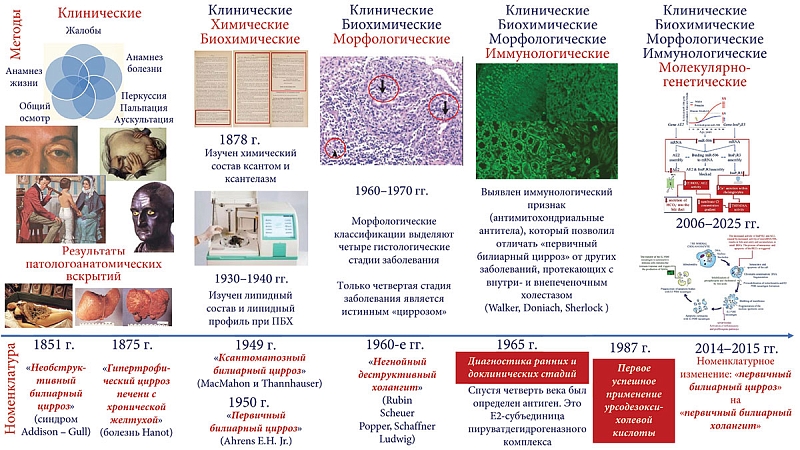 Историческая этапность раскрытия и описания различных признаков, механизмов их развития, изложенная в этом обзоре, демонстрирует значение и вклад лабораторных (химических, биохимических, морфологических, иммунологических, молекулярно-генетических и др.) и инструментальных (чрескожная пункционная биопсия печени) методов в изучение ПБХ. Особую роль в улучшении диагностики этого заболевания сыграло развитие иммунологии и иммунологических методов исследования. Выявление АМА наряду с повышением активности щелочной фосфатазы и гаммаглутамилтрансферазы позволяет диагностировать ПБХ в асимптоматической стадии заболевания. Несмотря на то что до настоящего времени этиология ПБХ неизвестна, раскрытие патогенетических механизмов, участвующих в прогрессировании этого заболевания, способствовало разработке современных способов его лечения, включая использование препаратов желчных кислот (урсодезоксихолевая кислота, тауроурсодезоксихолевая кислота, обетихолевая кислота, норурсодезоксихолевая кислота). С появлением новых молекулярно-генетических методов исследований и благодаря усилиям ученых, направленным на раскрытие этиологии и патогенеза заболевания, в ближайшем будущем станет возможным появление новых лекарственных препаратов, способных приостановить прогрессирование и предупредить возникновение ПБХ.