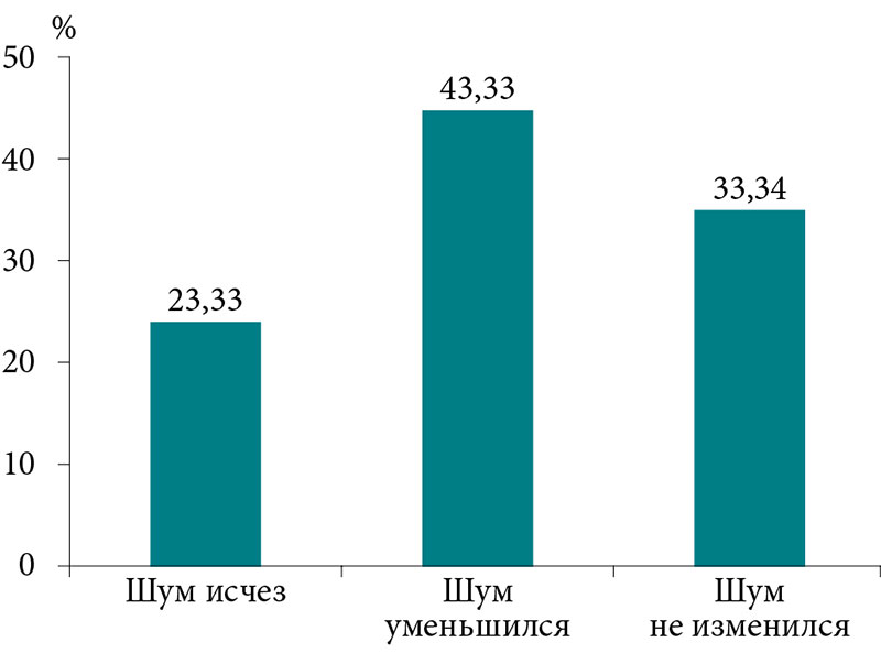 Всем пациентам проводили тональную пороговую аудиометрию, шумометрию, импедансометрию, анкетирование по визуальной аналоговой шкале (ВАШ) шума до и после лечения. При проведении тональной аудиометрии признаки нарушения звуковосприятия были обнаружены у всех пациентов. По данным импедансометрии, тимпанограмма типа А была зарегистрирована у всех пациентов. Акустические рефлексы были зарегистрированы, пороги регистрации повышены. При оценке результатов анкетирования по ВАШ клинически значимыми изменениями шума, по мнению экспертов, считали изменения не менее чем на два балла в ту или иную сторону. Для каждого пациента данные изменения были распределены по четырем категориям следующим образом: «шум исчез», «шум не изменился», «шум уменьшился» и «шум усилился». Случаи с разницей между начальными и конечными оценками шума менее двух баллов были отнесены к категории «шум не изменился». Случаи с разницей в два балла и более были отнесены к категории «шум уменьшился» или «шум усилился» в зависимости от направления изменений. Если на последнем этапе субъективная оценка шума в анкете была равна нулю, то данный случай относили к категории «шум исчез».