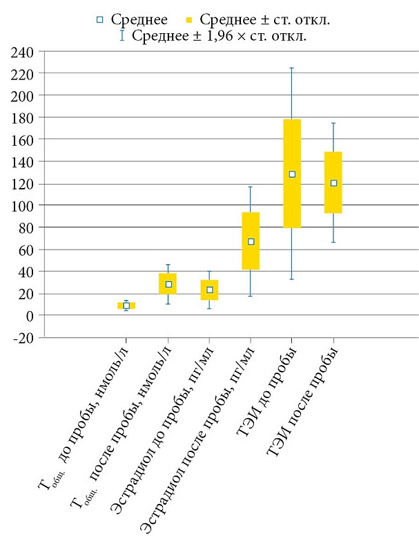 В качестве скрининга всем пациентам назначалась проба с ХГЧ по 1500 ЕД внутримышечно в течение трех дней, с последующим на четвертые сутки контролем натощак в сыворотке венозной крови уровня общего тестостерона, эстрадиола, глюкозы, инсулина, расчета тестостерон-эстрадиолового индекса и HOMA-IR. Уровень ТЭИ рассчитывали по формуле: Тобщ (пг/мл) / Е2 (пг/мл). Индекс ИР оценивали по формуле: (инсулин натощак (мкЕД/мл) × глюкоза натощак (ммоль/л)) / 22,5. Забор венозной крови на исследование проводили до 10 часов утра, натощак, при половом воздержании в течение суток. Кровь помещали в пробирки объемом 5 мл, после свертывания жидкую часть переносили в чистые стерильные пробирки, центрифугировали при комнатной температуре в лабораторной центрифуге 1800 g (3000 об/мин) в течение десяти минут, затем надосадочную жидкость переносили в промаркированные одноразовые пластиковые пробирки типа Эппендорф. Уровень гормонов определяли с помощью аналитической системы Tecan Sunrise RC4 (Tecan, Австрия). Статистический анализ проводили с помощью пакета прикладных программ Microsoft Excel 2013 и программы Statistica 10 (StatSoft, Inc.), использовали непараметрические статистические методы Фишера и Вилкоксона. Данные считали достоверными при p ≤ 0,05.