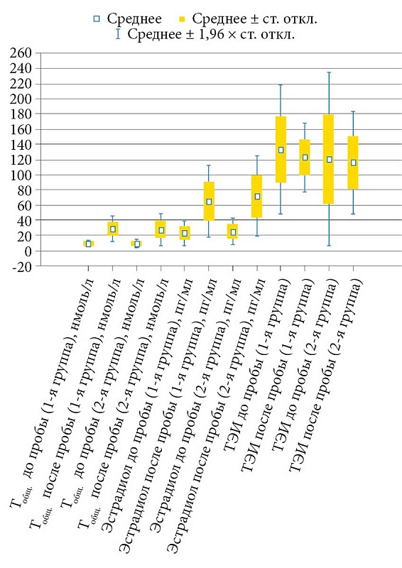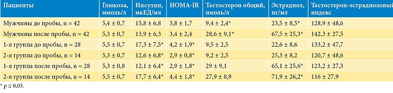 На рисунке 4 показаны средние значения и стандартное отклонение гормональных показателей. Обращает на себя внимание то, что уровень эстрадиола после пробы в первой группе был статистически значимо ниже по сравнению со второй группой и составил 65,1 ± 25,6 против 71,9 ± 26,2 пг/мл соответственно (р = 0,05), а различия значений тестостерона и тестостерон-эстрадиолового индекса были статистически незначимы (p = 0,7). В таблице приведены значения гликемического профиля и гормонов у всех мужчин и между группами до и после проведения пробы с ХГЧ. Далее всем пациентам назначали курс стимулирующей гормональной или ЗГТ в виде монотерапии либо, в случае повышения уровня инсулина и HOMA-IR, дополнительно проводили медикаментозную коррекцию ИР совместно с эндокринологом.