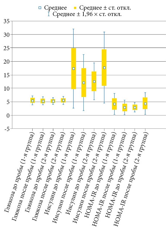 Средние значения и стандартное отклонение показателей глюкозы, инсулина и HOMA-IR в сравниваемых группах отображены на рис. 3. До проведения пробы в первой группе по сравнению со второй значения уровня инсулина (17,3 ± 7,5 против 12,6 ± 6,8 мкЕД/мл соответственно; p = 0,03) и HOMA-IR (4,2 ± 1,9 против 2,9 ± 0,8 соответственно; p = 0,05) были статистически достоверно выше. После проведения пробы уровень инсулина в первой и второй группах статистически различался (12,1 ± 6,4 против 17,7 ± 6,4 мкЕД/мл соответственно; p < 0,01), а также значимо различался HOMA-IR и составил в первой группе 2,9 ± 1,8 против 4,4 ± 1,8 во второй (p = 0,01). Уровень глюкозы в двух группах до и после проведения пробы с ХГЧ статистически достоверно не изменялся.