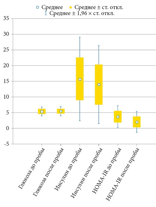 Цель исследования – оценить изменение уровня глюкозы, инсулина и HOMA-IR при проведении трехдневной пробы с ХГЧ у мужчин с гипогонадизмом.