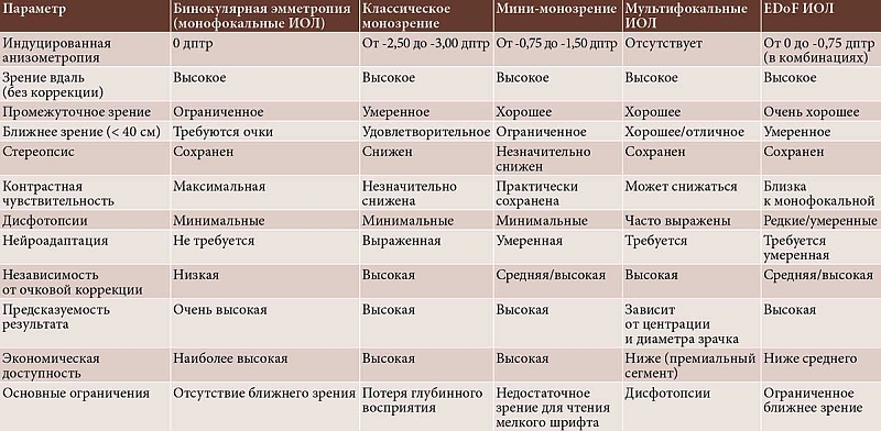 Сравнительная характеристика рефракционных стратегий в хирургии катаракты представлена в таблице.