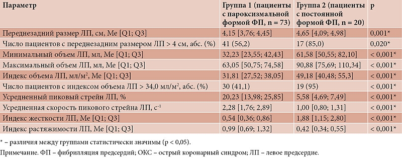 В отечественном исследовании И. Орловой и соавт. также проводили оценку эхокардиографических параметров ЛП в группах с различными формами ФП: 1-я группа – 70 пациентов с пароксизмальной формой (медиана возраста 73,0 [64,75; 76,5] года, 30% мужчин) и 2-я группа – 54 пациента с постоянной или персистирующей формой (медиана возраста – 78,5 [68,0; 83,0] года, 39% мужчин). Выявлено, что во 2-й группе по сравнению с 1-й были статистически значимо больше линейные и объемные параметры ЛП (р < 0,001 для всех сравнений): переднезадний размер ЛП (4,6 и 4,0 см соответственно), максимальный объем ЛП (60,4 и 35,4 мл соответственно), индекс объема ЛП (44 и 35,4 мл/м2 соответственно) и индекс жесткости ЛП (1,4 и 0,6 соответственно) [24]. В то же время пациенты 2-й группы имели статистически значимо меньшие (р < 0,001 для всех сравнений) значения ряда параметров спекл-трекинг ЭхоКГ: усредненный стрейн ЛП (6,1 и 18,3% соответственно), усредненную скорость стрейна ЛП (1,1 и 2,3 с-1 соответственно) и индекс растяжимости ЛП (0,4 и 0,9 соответственно) [24]. К сожалению, в описании вышеприведенных исследований нет данных о частоте сопутствующей ИБС или наличия ИМ в анамнезе [23, 24]. Однако, несмотря на различия в дизайне, эти данные соответствуют результатам нашего исследования, в котором принимали участие пациенты с ФП и перенесенным ОКС.