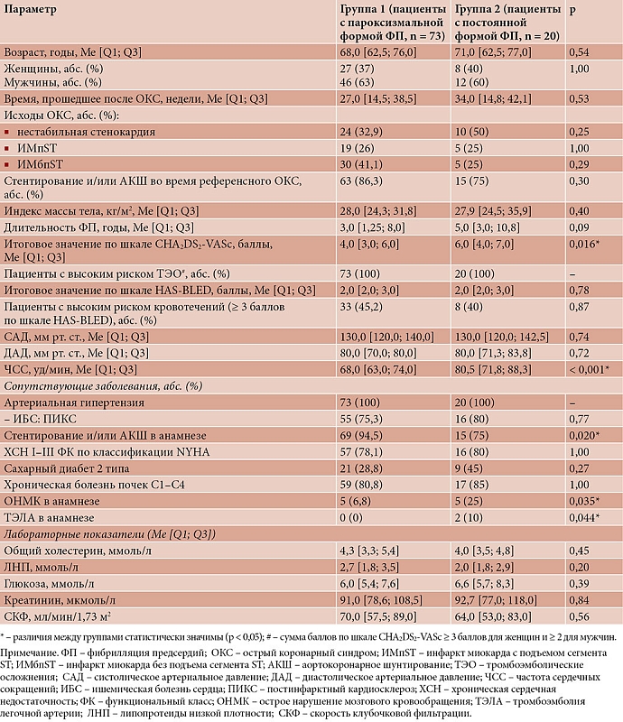 Проведен анализ клинико-демографических характеристик, сопутствующих заболеваний, данных лабораторных методов исследования и медикаментозной терапии в двух группах в зависимости от формы ФП (табл. 1).