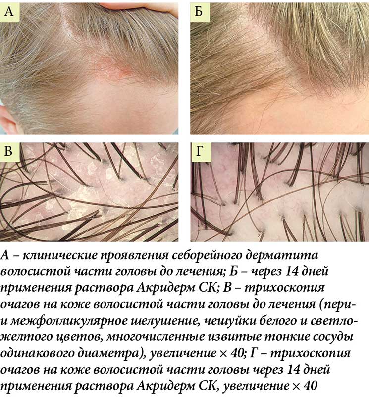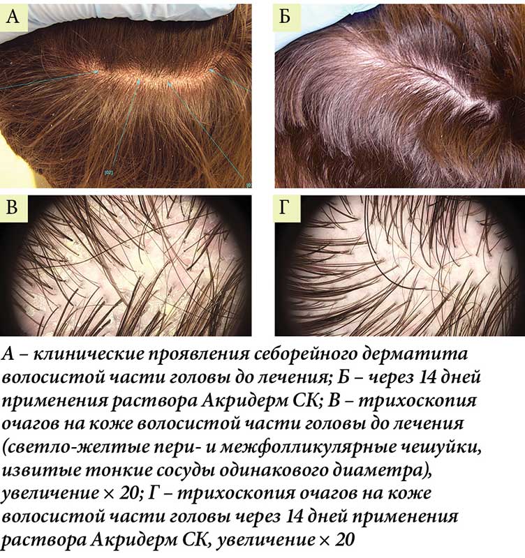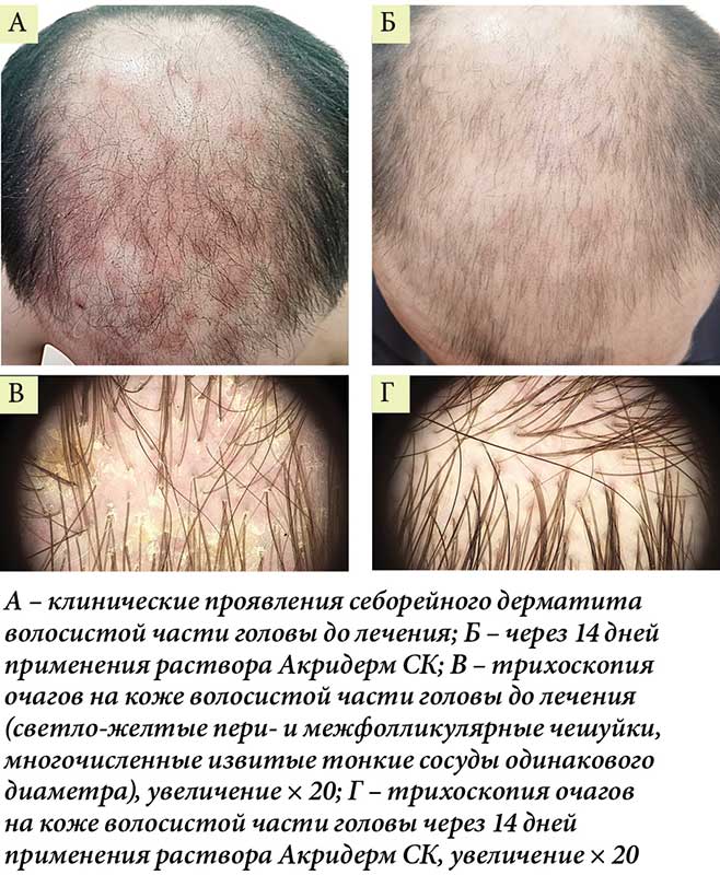 Всем пациентам проводили наружную терапию в соответствии с актуальными клиническими рекомендациями: каждый из пациентов в режиме топической монотерапии использовал раствор Акридерм СК на кожу волосистой части головы два раза в день в течение 14 дней [4].