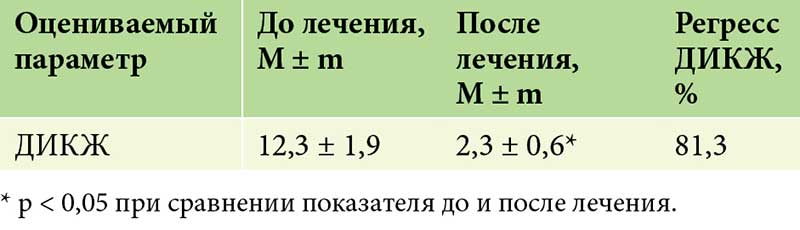 Данные клинической эффективности наружной терапии раствором Акридерм СК у больных также подтверждены положительной динамикой показателя качества жизни. Так, через 14 дней наружного лечения ДИКЖ достоверно снизился на 81,3% и составил в среднем 2,3 ± 0,6 балла, что свидетельствовало о почти полном восстановлении у пациентов качества жизни (табл. 2).