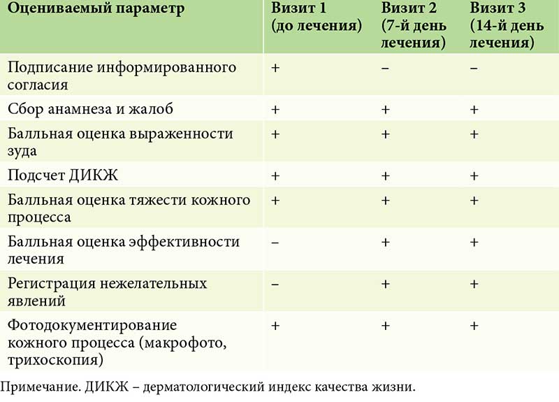 Для объективизации оценки клинических показателей состояния кожи и эффективности проводимой терапии была использована индивидуальная карта наблюдения больного, где лечащий врач фиксировал клинико-анамнестические данные, балльную оценку тяжести заболевания, отмечал влияние заболевания на качество жизни, а также возникшие нежелательные явления. Схема мониторирования клинических данных и визитов пациентов при проведении исследования представлена в табл. 1.