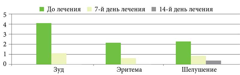 До начала наружной терапии больные себорейным дерматитом волосистой части головы отмечали умеренную интенсивность зуда, что в среднем по группе составило 4,52 ± 1,07 балла, эритему (2,41 ± 0,5 балла) и выраженное шелушение кожи (2,52 ± 0,51 балла).