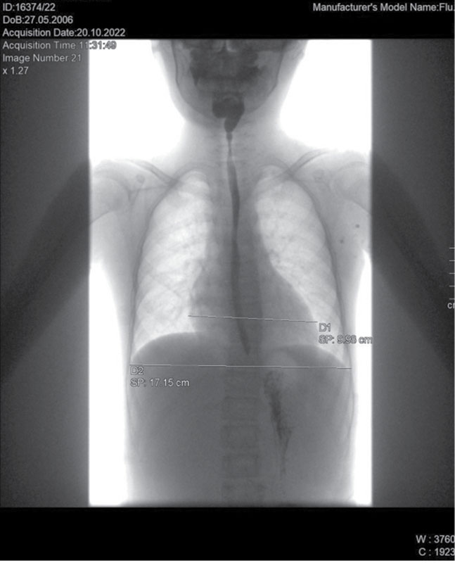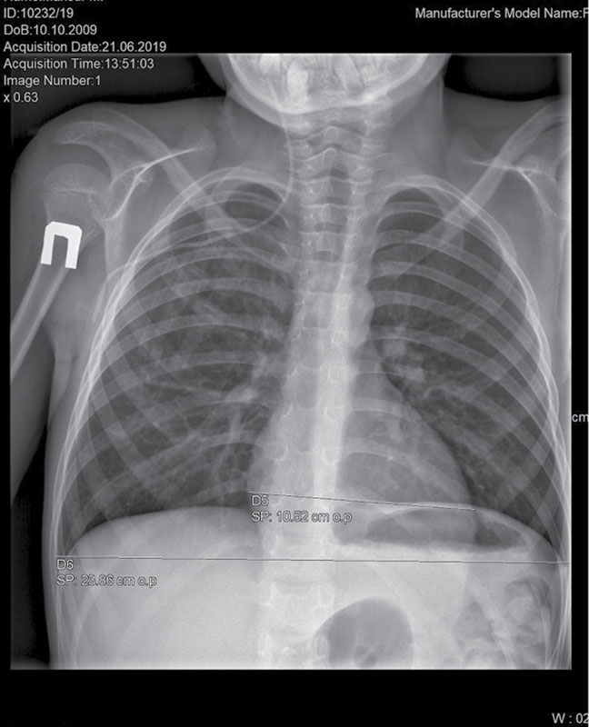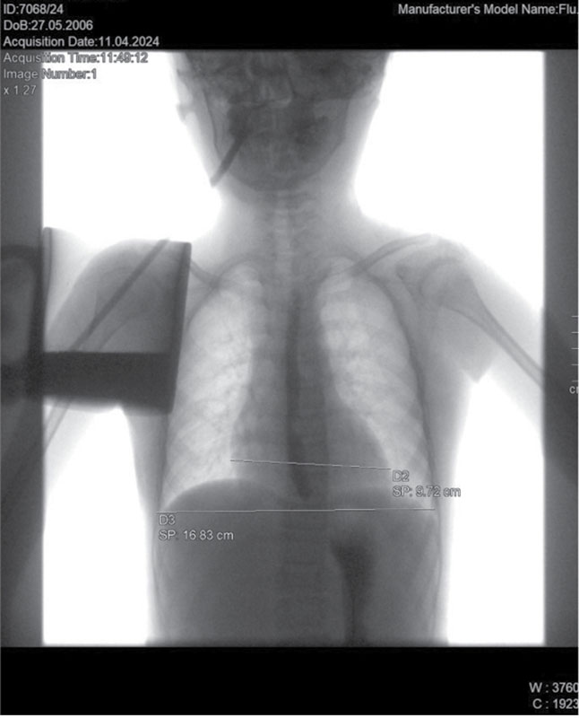 При проведении рентгенологического исследования сердечно-грудной индекс был в пределах нормы – 0,44 (горизонтальный размер тени сердца – в норме (10,52 см)) (рис. 3).