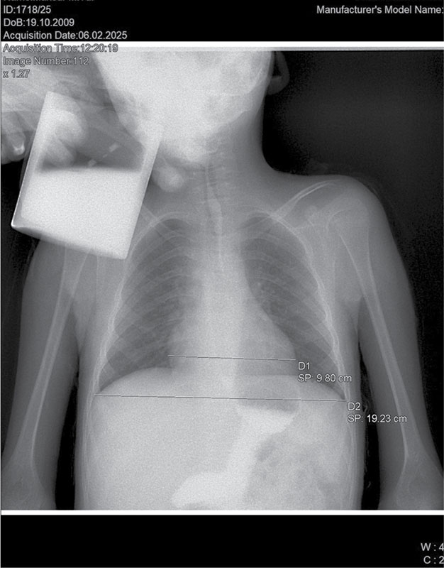 Рентген органов грудной клетки: отмечается повышенный горизонтальный размер тени сердца, однако в динамике отмечается снижение до 9,72 см. Сердечно-грудной индекс также снизился до 0,57 (рис. 2).