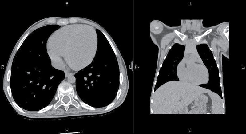 Компьютерная томография органов грудной полости: острых очаговых и инфильтративных изменений в органах грудной полости не выявлено. Размеры лимфоузлов средостения и корней легких в пределах нормальных величин. Отмечается увеличение ЛЖ (рис. 5).