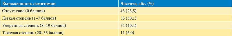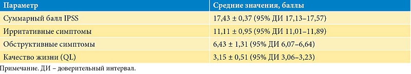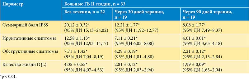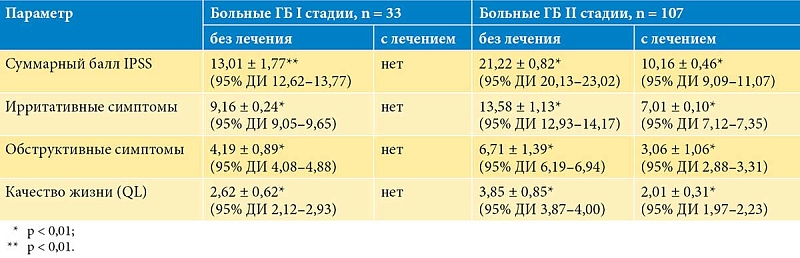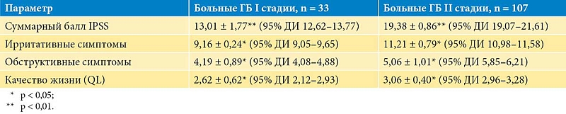 При анализе данных анкетирования по IPSS у большинства пациентов, страдающих ГБ, выраженность симптомов нарушенного мочеиспускания по принятой классификации [30, 31] в основном характеризовалась как легкая и умеренная, хотя были пациенты и с тяжелой степенью выраженности нарушенного мочеиспускания (табл. 2).