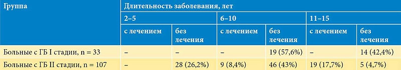 У всех мужчин с I стадией ГБ и СНМП длительность существования артериальной гипертензии составляла более пяти лет, причем они никогда не получали систематического гипотензивного лечения. А в группе пациентов с ГБ II стадии постоянное лечение по поводу артериальной гипертензии получали только 28 человек (26,2%), остальные 79 пациентов лечение не получали, или оно было несистематическим. Длительность «гипертонического» анамнеза при ГБ II стадии составила от двух до пятнадцати лет (табл. 1).