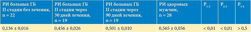 При анализе количественного показателя тазовой реограммы (РИ) у больных ГБ выявлено статистически значимое его снижение у всех пациентов (n = 73) по сравнению с аналогичными показателями здоровых мужчин (n = 28): 0,393 ± 0,033 против 0,446 ± 0,046; p < 0,02.