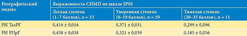 Поскольку основным патогенетическим механизмом развития СНМП, в том числе и детрузорной гиперактивности, принято считать нарушение кровообращения в мочевом пузыре, при котором субэпителиальная ишемия и гипоксия повреждают эпителий мочевого пузыря и нарушают его функцию [40, 41], а ишемия мышечной стенки способна привести к нестабильности работы детрузора, была оценена возможная связь гемодинамических нарушений малого таза при ГБ с наличием и выраженностью СНМП. Для этого все 73 пациента были поделены на три группы в зависимости от выраженности нарушенного мочеиспускания, оцененного по шкале IPSS. При анализе результатов выявлено, что у пациентов с СНМП имеется прямая зависимость выраженности симптомов от состояния гемодинамики малого таза, определяемого реографически. Чем хуже показатели кровотока по реограмме, тем выраженнее СНМП (табл. 8).