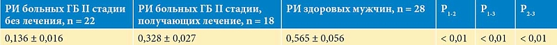 При сравнительном анализе количественных показателей тазовой реограммы у мужчин с ГБ II стадии в зависимости от наличия гипотензивной терапии выявлена статистически значимая (р < 0,01) разница. У мужчин с ГБ II стадии, получающих лечение (n = 18), РИ отличался от нормы (0,421 ± 0,024), но эти отличия были незначимы (p > 0,5), в то время как у мужчин, никогда не лечившихся по поводу ГБ (n = 22), количественный показатель кровотока в малом тазу был значимо снижен (0,291 ± 0,076).