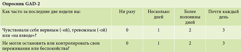 PHQ-2 включает два вопроса о симптомах депрессии за последние две недели (суммарный балл ≥ 3 свидетельствует о вероятной депрессии), а GAD-2 представляет собой аналогичную шкалу из двух вопросов для оценки тревоги (суммарный балл ≥ 3 указывает на возможное тревожное расстройство (рис. 2) [57, 58].