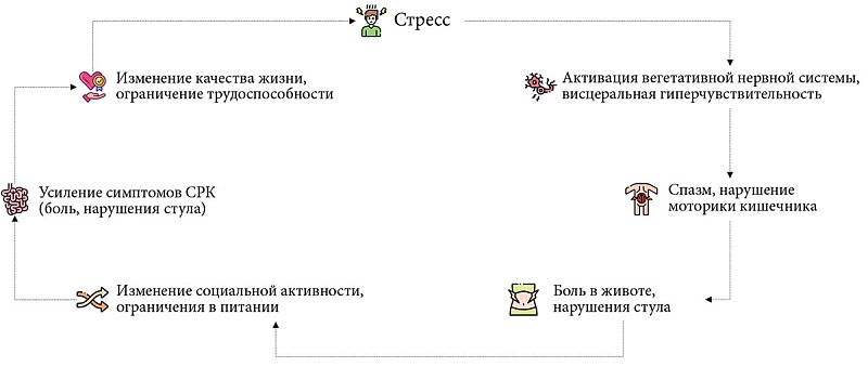 Наконец, все больше данных свидетельствует о том, что психологический стресс способен приводить к нарушению целостности кишечного барьера. Активация ГГН оси с повышенным выбросом кортизола приводит к изменению состава микробиоты, ослаблению межэпителиальных контактов и усилению продукции провоспалительных цитокинов. Таким образом, психоэмоциональные факторы формируют порочный круг: стресс → активация вегетативной нервной системы (ВНС) и висцеральная гиперчувствительность → спазм и нарушение моторики кишечника → боль в животе и нарушения стула → изменение социальной активности и ограничения в питании → усиление симптомов СРК → изменение качества жизни и ограничение трудоспособности → еще больший стресс у пациента [7, 14, 23, 42–46]. Боль и висцеральная гиперчувствительность, в свою очередь, усиливают стрессовую реакцию, а также способствуют мышечному спазму, усиливая отдельные звенья порочного круга [43, 44, 46] (рис. 1).
