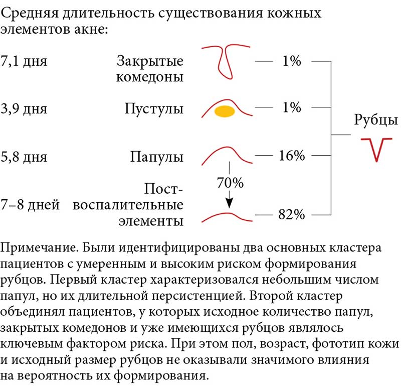 Вероятность формирования рубцов постакне определяется как количеством и типом кожных элементов, так и длительностью воспалительного процесса при акне. Tan и соавт. в 2017 г. провели проспективное исследование для оценки факторов, влияющих на риск развития атрофических рубцов постакне, и установили, что образование рубцов продолжалось на протяжении всего периода наблюдения за пациентами с угревой болезнью (шесть месяцев). Большинство атрофических рубцов (66,2%) сохранялись к окончанию наблюдения, тогда как остальные носили транзиторный характер. Вероятность трансформации элемента акне в рубец составила 5,7%; при этом подавляющее большинство рубцов формировалось после разрешения воспалительных элементов с поствоспалительной гиперпигментацией (82%) и лишь меньшая их часть (17%) – непосредственно из папул и пустул. Длительность существования папул оказалась ключевым предиктором формирования рубцов. Более того, 81,7% рубцов, сохранявшихся через шесть месяцев, носили стойкий характер и при двухлетнем последующем наблюдении, что свидетельствует о необходимости ранней и адекватной терапии акне для профилактики рубцевания [12]. Результаты исследования представлены на рис. 2.