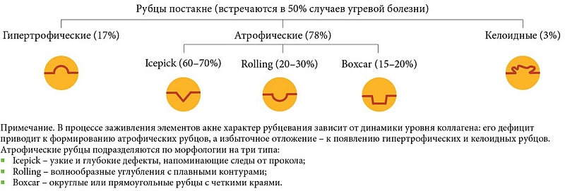 Формирование рубцов представляет собой еще один значимый аспект, усиливающий негативное влияние акне на качество жизни пациентов. По данным клинических наблюдений, в среднем около 50% случаев угревой болезни сопровождаются развитием рубцов постакне [8, 11]. Рубцы являются стойкими косметическими дефектами, с трудно поддающейся коррекции структурой, способной сохраняться на протяжении всей жизни [8]. Классификация и эпидемиологические характеристики рубцов постакне представлены на рис. 1 [8].