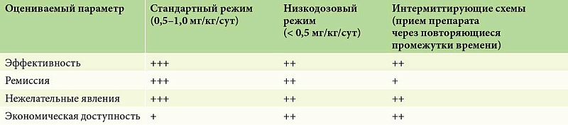 Выбор режима дозирования системного изотретиноина представляет собой важный аспект терапии акне и требует индивидуального подхода с учетом клинической картины, анамнеза пациента и переносимости препарата. Современные терапевтические стратегии включают стандартные, низкодозовые и интермиттирующие схемы лечения, каждая из которых обладает определенными преимуществами и ограничениями (таблица).