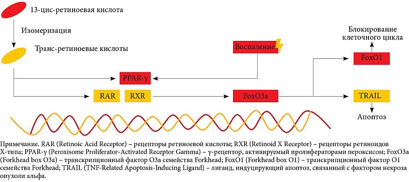 Изотретиноин представляет собой пролекарство, которое под действием изомераз преобразуется из 13-цис-ретиноевой кислоты в различные транс-формы. Транс-ретиноевые кислоты взаимодействуют с ядерными рецепторами RAR и RXR, инициируя каскад транскрипционных изменений, опосредованных факторами FoxO3a, FoxO1 и TRAIL. Это приводит к индукции апоптоза и блокированию клеточного цикла. Дополнительную роль в регуляции активности RXR играет рецептор PPAR-γ, который, образуя гетеродимеры с RXR, также способен связываться с транс-ретиноевыми кислотами. Уровень экспрессии PPAR-γ увеличивается при воспалении, что может объяснять высокую эффективность изотретиноина при акне с выраженным воспалительным компонентом.