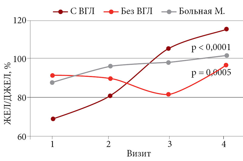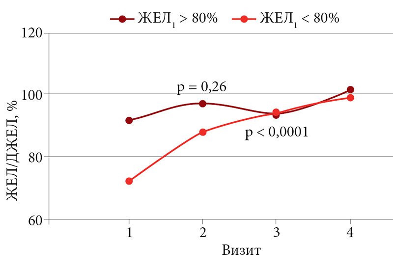 Исследование динамики ЖЕЛ при внутригрудном поражении в группах с ее различной исходной величиной (рис. 1) показало, что медианы ЖЕЛ быстро увеличиваются в группе с исходно сниженными показателями ФВД: 72,3 (68,1–78,8)% от должной ЖЕЛ (ДЖЕЛ) – на первом визите; далее последовательно – 88,2 (77,7–96,8)%, 94,7 (85,3–105,8)% и 99,4 (85,3–114,0)%; в то же время у больных с нормальными показателями ЖЕЛ на старте обследования в дальнейшем динамика была незначительной, с периодами повышения и снижения: 92,3 (87,8–98,2)% – на старте обследований, 97,4 (80,3–100,0)% – на втором визите, несколько меньше 93,8 (88,2–108,0)% – на третьем визите, и на четвертом ЖЕЛ вновь повышалась до нормальной величины – 101,5 (86,1 – 108,0)%.