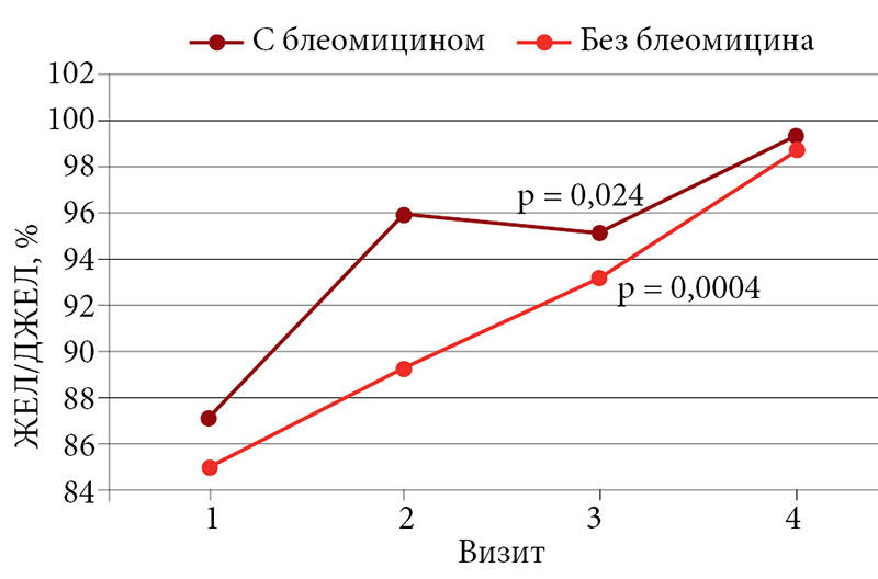 При исследовании влияния пульмонотоксичности на показатели ФВД в группах больных, получавших и не получавших блеомицин, мы выявили динамическое увеличение ЖЕЛ до нормальных значений, р = 0,024 и р = 0,0004 соответственно. При этом, именно в группе больных, принимавших блеомицин, в период окончания ХТ происходило некоторое снижение ЖЕЛ. У пациентов, не получавших блеомицин, динамика ЖЕЛ закономерно представляет прямую по увеличению этого показателя на фоне проводимой противоопухолевой терапии.
