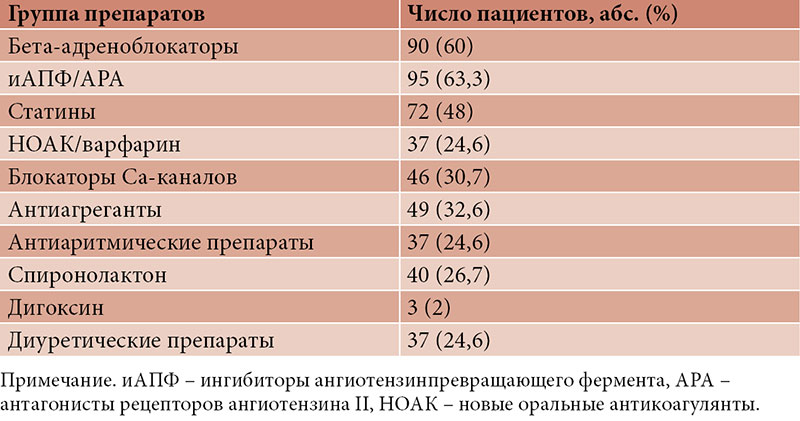 В нашем исследовании ХСН была выявлена у 92 (61,3%) пациентов. Индекс коморбидности Чарлсона (Charlson Comorbidity Index, CCI) варьировался от 3 до 13 баллов: медиана индекса Чарлсона составила 6 баллов с интерквартильным размахом 5–8 баллов. У 135 пациентов было 3 или более ССЗ. На всех этапах лечения больные получали кардиальную терапию (табл. 1).
