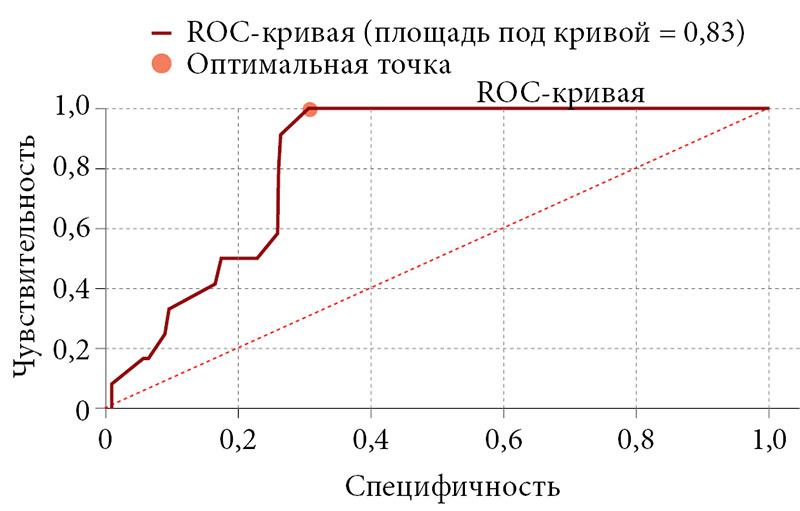 Для определения прогностической значимости влияния возраста на развитие кардиологических осложнений был использован ROC-анализ с вычислением площади под кривой, АUC (рис. 1). Площадь под кривой составила 0,827 (95% ДИ 0,754–0,902), для оптимальной точки разделения 77 лет чувствительность составила 100%, специфичность – 70%. Исходно из ССЗ у всех 12 повторно госпитализированных пациентов были АГ и атеросклероз периферических артерий. Нарушения проводимости сердца выявлены у 10 (83,3%) пациентов, ИБС – у 9 (75%), ФП – у 7 (58,3%), клапанные пороки сердца – у 2 (16,7%), сахарный диабет 2 типа – у 6 (50%), ОНМК – у 3 (25%), ожирение – у 10 (83,3%), варикозная болезнь вен у 3 (25%) пациентов. Группы больных с ССО и без таковых статистически значимо различались по заболеваемости ИБС (р = 0,0049), ФП (р = 0,0134), ожирением (р = 0,000145).
