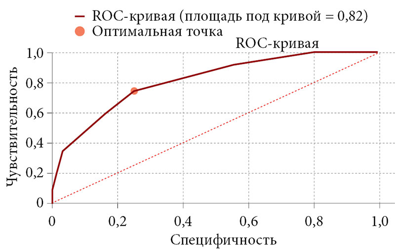 При сравнении показателя индекса коморбидности Чарлсона в двух группах различия были статистически значимы (р = 0,0002). У пациентов без осложнений медиана составила 7 баллов с интерквартильным размахом 6–8 баллов, а у пациентов с кардиологическими осложнениями медиана составила 9 баллов с интерквартильным размахом 7,8–11,3 балла. Между индексом коморбидности Чарлсона и риском возникновения ССО отмечается прямая, статистически значимая корреляционная связь умеренной тесноты по шкале Чеддока (rxy Спирмена = 0,31; p = 0,00017). Для определения прогностической значимости влияния индекса коморбидности Чарлсона на развитие кардиологических осложнений был использован ROC-анализ с вычислением площади под кривой, АUC (рис. 4). Площадь под кривой составила 0,815 (95% ДИ 0,7–0,9); для оптимальной точки – 8 баллов: чувствительность составила 75%, а специфичность – 74,6%.
