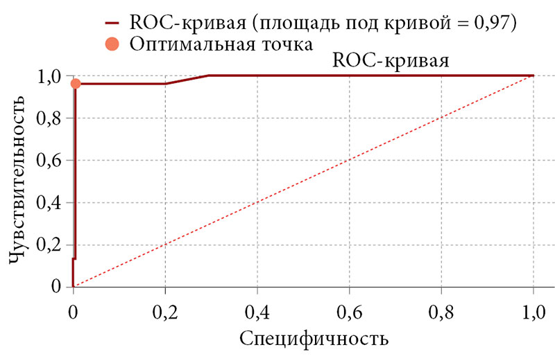 Для определения прогностической значимости влияния ФВ ЛЖ на развитие кардиологических осложнений был использован ROC-анализ с вычислением площади под кривой, АUC (рис. 3). Площадь под кривой составила 0,97 (95% ДИ 0,94–0,99); для оптимальной точки разделения – 47%: чувствительность составила 93%, специфичность – 98%.