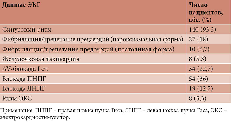 По данным ЭхоКГ: ФВ ЛЖ у пациентов составила 60% с интерквартильным размахом 56–64%; нарушения локальной сократимости миокарда выявлены у 28 (18,7%) пациентов; медиана систолического давления в легочной артерии (СДЛА) составила 28 мм рт. ст. с интерквартильным размахом 25–33 мм рт. ст.