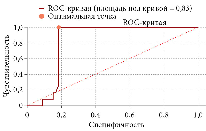 Для выявления прогностической значимости влияния уровня NT-proBNP на развитие ССО был использован ROC-анализ с вычислением площади под кривой, АUC (рис. 2). Площадь под кривой составила 0,83 (95% ДИ 0,74–0,91); для оптимальной точки разделения – 704,4 пг/мл: чувствительность составила 100%, специфичность – 82%. Группы были сопоставимы по уровню СДЛА (р = 0,32) и наличию нарушений локальной сократимости миокарда (р = 0,12).