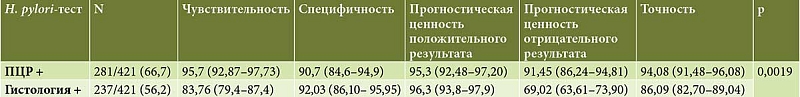 Material and methods. The study included 421 patients (321 patients from the A.S. Loginov Moscow Clinical Scientific Center, Moscow, and 100 patients from CHU in Nantes, France. All patients underwent upper endoscopy with multiple biopsies taken from the body and antrum of the stomach for further detection of H. pylori using PCR (421 patients), histological (421 patients), and bacteriological (100 patients) methods.