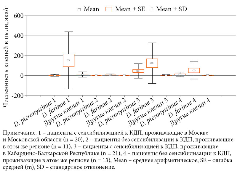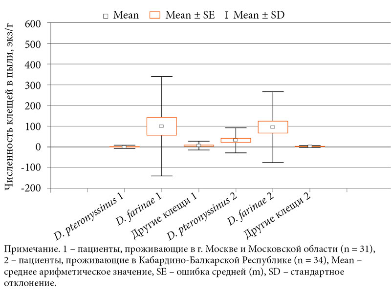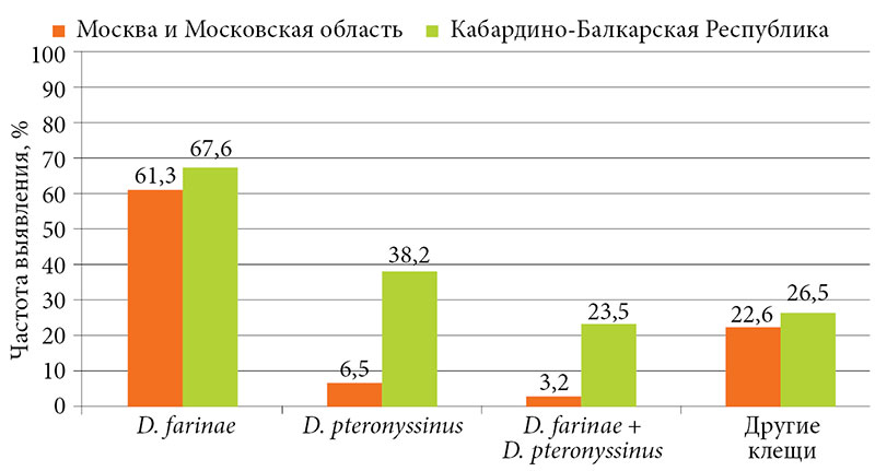 Результаты. Акарокомплексы домашней пыли жилых помещений г. Москвы, Московской области и Кабардино-Балкарской Республики обладают как общими, так и специфическими чертами. К общим чертам следует отнести низкое таксономическое разнообразие клещей семейства Pyroglyphidae. Так, выявлены только два вида данного семейства – Dermatophagoides farinae и Dermatophagoides pteronyssinus. При этом в двух различающихся по климату регионах – г. Москве, Московской области и Кабардино-Балкарии – абсолютно доминировал D. farinae. Специфической чертой акарокомплекса домашней пыли в г. Москве и Московской области стал большой разрыв между D. farinae и D. pteronyssinus как по численности, так и по встречаемости. В Московском регионе численность D. farinae в 65,5 раза превышала численность D. pteronyssinus, а встречаемость – в 9,4 раза. В акарофауне жилых помещений Кавказа разница между показателями оказалась меньше – в 3,0 и 1,8 раза соответственно. При этом численность и встречаемость D. pteronyssinus в акарокомплексе пыли из помещений Кабардино-Балкарии в 17,4 и 5,9 раза соответственно превосходила таковые в помещениях г. Москвы и Московской области. Амбарные клещи выявлены только в пыли жилых помещений Кабардино-Балкарии.