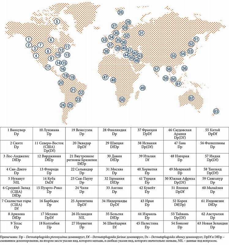 Более 60 лет прошло с того момента, когда впервые было доказано, что клещи, заселяющие домашнюю пыль, продуцируют аллергены, сенсибилизация к которым может вызывать развитие аллергических заболеваний. В настоящее время проблема сенсибилизации к аллергенам клещей домашней пыли (КДП) семейства Pyroglyphidae и амбарно-зернового комплекса (АЗК) семейств Acaridae и Glycyphagidae не теряет своей актуальности, поскольку данные клещи имеют широкое гео­графическое распространение. Считается, что они встречаются по всему земному шару, кроме Арктики и Антарктики [1–5]. Последнее может быть объяснено тем, что на данных территориях пыль из жилищ людей не изучалась. Помимо жилых помещений данные клещи были обнаружены в общественных помещениях (школах, детских садах, интернатах, гостиницах, театрах и т.д.), а также в транспортных средствах (в поездах дальнего следования, салонах самолетов, на субмарине и космической станции [3]).