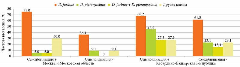 Рис. 4. Частота выявления различных клещей в пыли жилых помещений пациентов с и без сенсибилизации к КДП в двух регионах