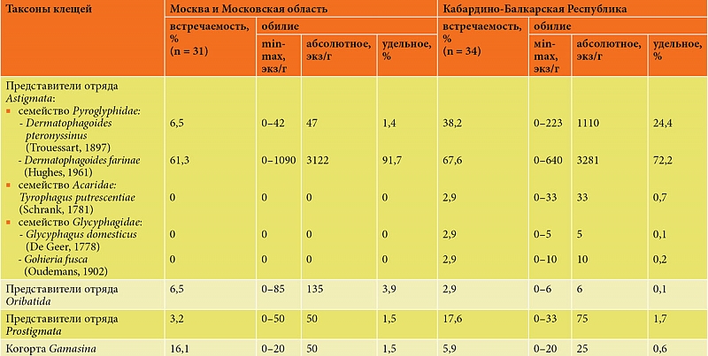 Цель исследования – провести сравнительный анализ структуры акарофауны домашней пыли в г. Москве, Московской области и Кабардино-Балкарской Республике.
