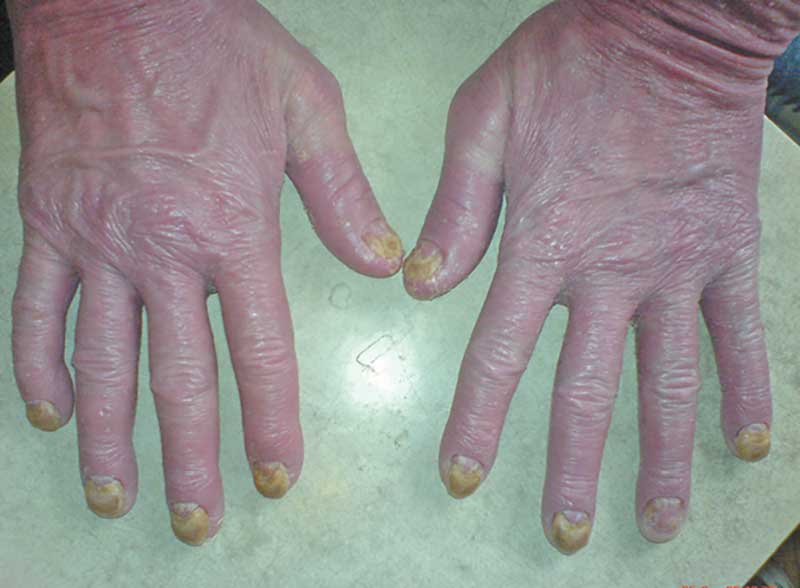 Распространенная эритема с поражением свыше 90% кожного покрова выявлена у всех 34 пациентов (рис. 6). Красный цвет высыпаний отмечен у 18 (52,94%) пациентов, темно-красный насыщенный – у 8 (23,53%), красно-фиолетовый – у 6 (17,65%), красный с другими оттенками – у 2 (5,88%) пациентов. Типичные для псориаза поражения ногтей по типу подногтевой гиперкератоз, точечные наперстковидные, симптом «масляного пятна», а также онихолизис встречались у 27 (79,41%) пациентов (рис. 7). Кератодермия ладонно-подошвенная установлена у 24 (70,59%) пациентов (рис. 8). Диффузная нерубцовая алопеция отмечена у 27 (79,41%) пациентов (рис. 9). Поражение гениталий или генито-анальной области выявлено у 25 (73,53%) пациентов (рис. 10).