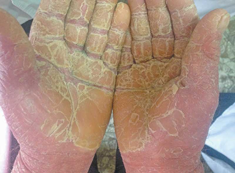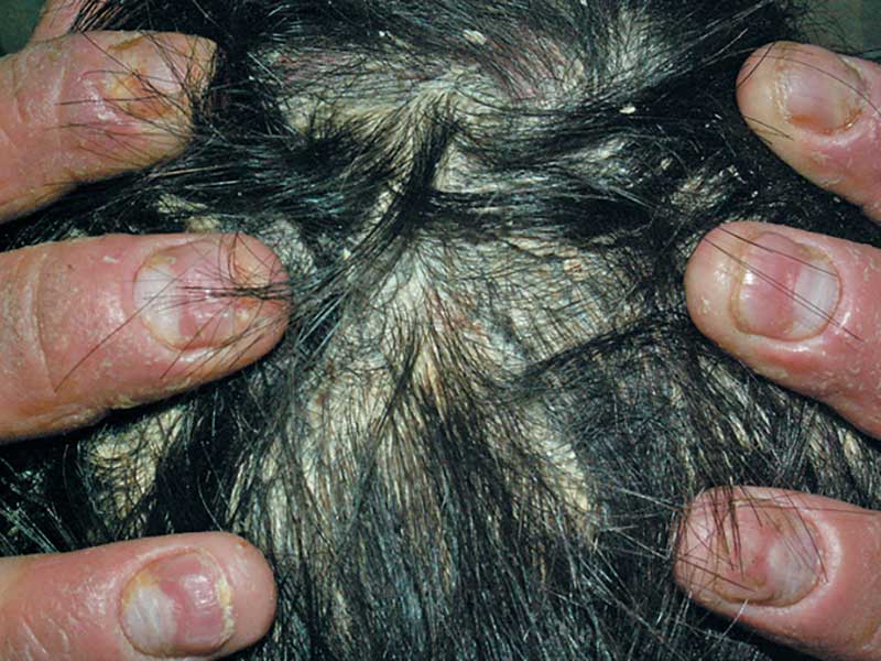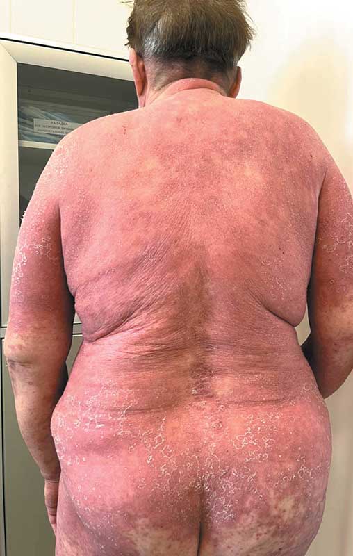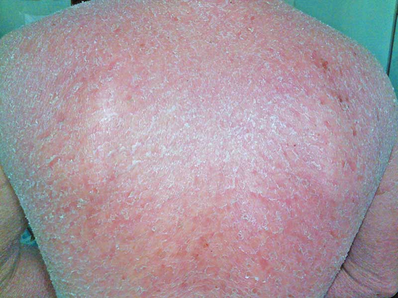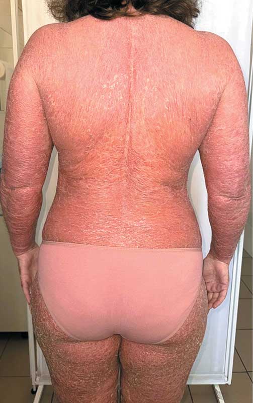 Кожный покров при ПЭ характеризуется развитием выраженной эритемы ярко-красного цвета с темным оттенком. Пораженная кожа напряжена и отечна. Мелко- и крупнопластинчатое шелушение появляется на туловище, конечностях, на волосистой части головы – преимущественно отрубевидное [1, 9, 10]. Также в некоторых случаях отмечается диффузное поредение волос, при этом типичные признаки псориаза (типичные бляшки, псориатическая триада, феномен Ауспитца) отсутствуют или слабо выражены.