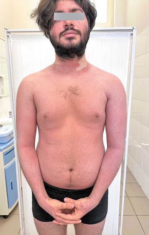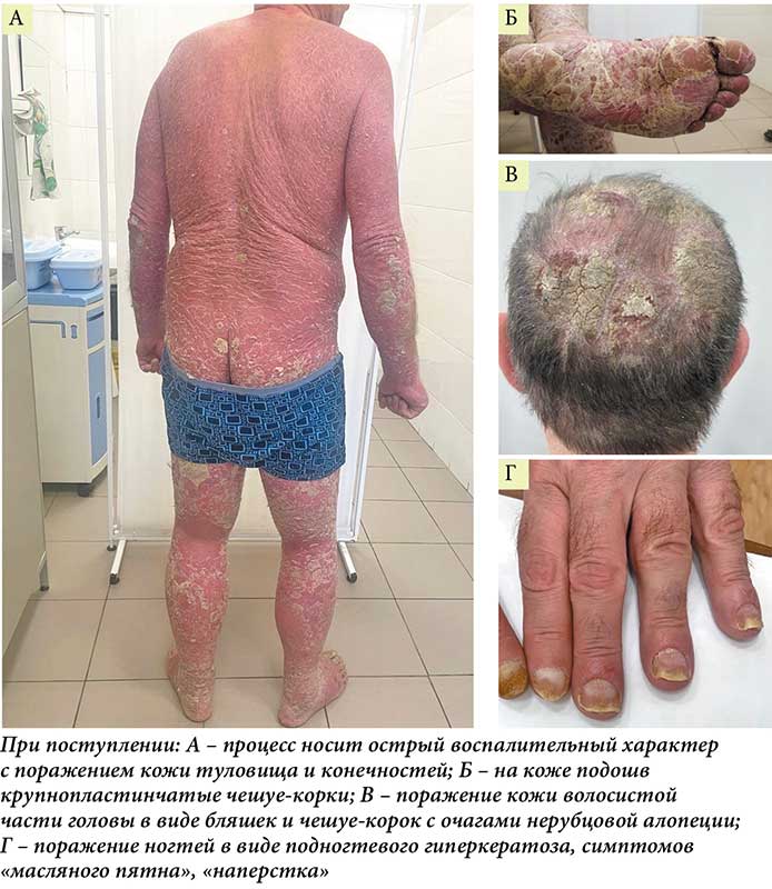 Распространенная эритема с поражением свыше 90% кожного покрова выявлена у всех 64 пациентов. Ярко-красный цвет высыпаний отмечался у 32 пациентов (61,54%) (рис. 2), ярко-розовый – у 12 (23,08%) (рис. 3), розово-красный – у 8 (15,38%) пациентов (рис. 4). Шелушение кожных покровов носило следующий характер: крупнопластинчатое было отмечено у 39 (60,91%) пациентов (рис. 5А), мелкопластинчатое – у 25 (39,13%) пациентов. Кератодермия ладонно-подошвенная установлена у 46 (71,87%) пациентов (рис. 5Б), диффузная нерубцовая алопеция – у 35 (54,69%) пациентов (рис. 5В). Характерные для псориаза поражения ногтей в виде подногтевого гиперкератоза, симптомов «масляного пятна», «наперстка» встречались у 28 пациентов (43,75%) (рис. 5Г). Поражение гениталий или аногенитальной области выявлено у всех больных с ПЭ. Повышение температуры тела выше 37 оС наблюдалось у 49 (76,56%) пациентов, лимфаденопатия – у 50 (78,13%), потеря веса – у 16 (25%) пациентов.