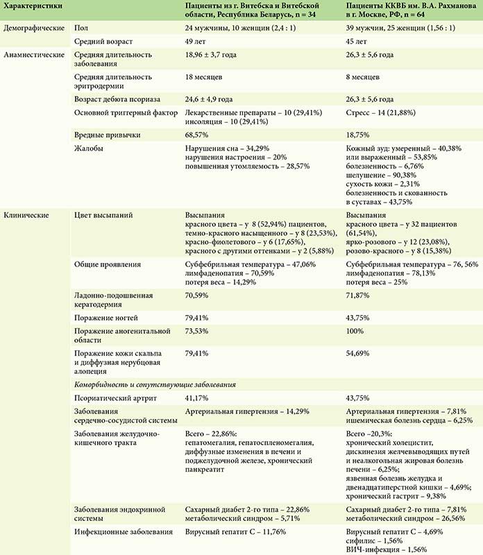 В результате сравнения демографических характеристик пациентов можно отметить преобладание эритродермической формы псориаза среди лиц мужского пола (60,94% в г. Москве и 70,58% в г. Витебске и Витебской области). В бразильском исследовании D. Miyashiro и соавт. также было отмечено, что при ПЭ заболеваемость выше и в более тяжелой форме характерна для мужчин (69,23%) [11].